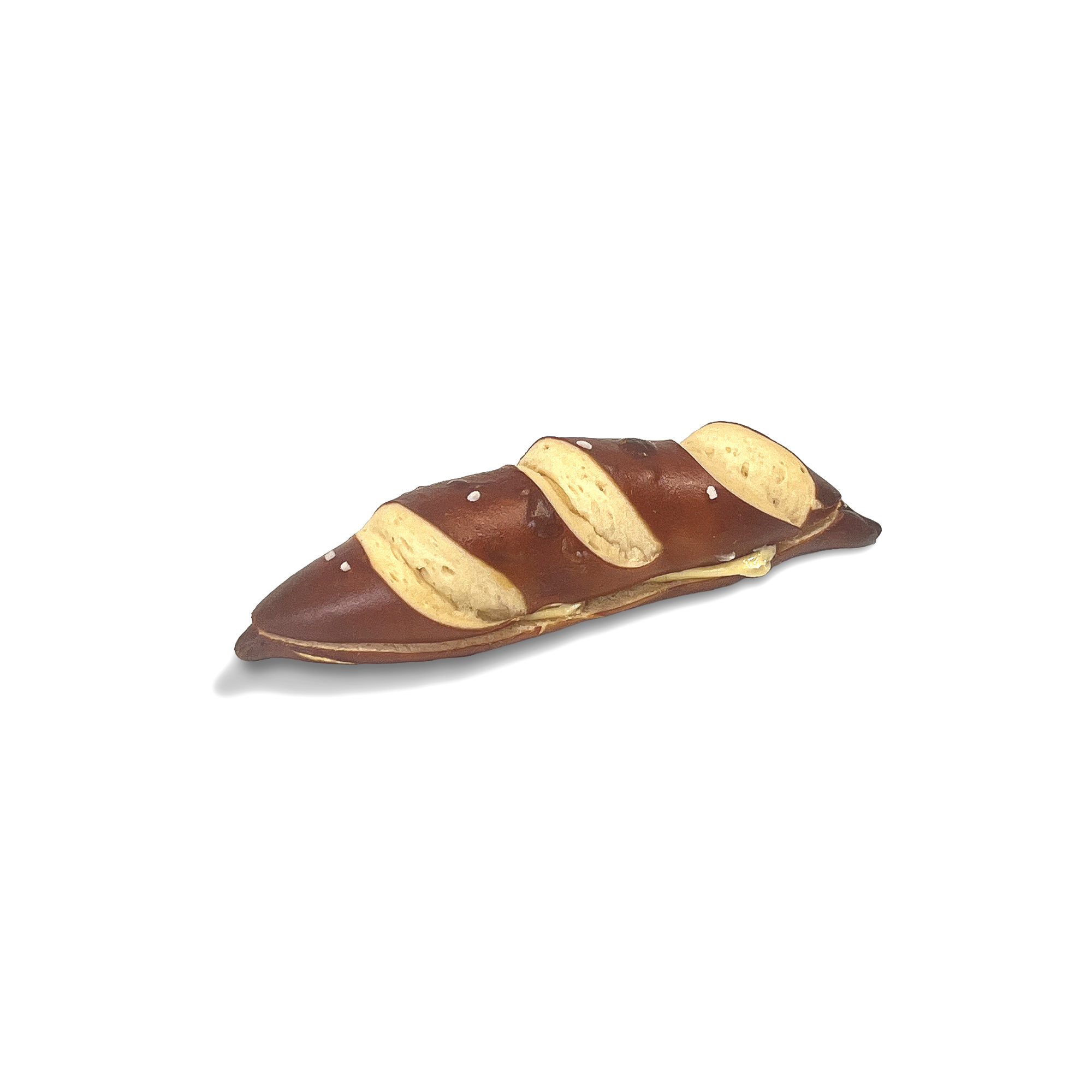 Bánh Bretzel Bơ gây ấn tượng với lớp vỏ màu nâu mật óng ả, dai nhẹ đặc trưng nhờ quá trình xử lý bột công phu. Điểm xuyết trên bề mặt là những hạt muối,, tạo nên vị mặn thanh tao làm dậy mùi thơm của bột mì nướng. Phần ruột bánh mềm dẻo được kẹp thêm lớp bơ lạt đầy đặn, tan chảy nhẹ nhàng ngay khi thưởng thức, mang đến hậu vị béo bùi, đậm đà.