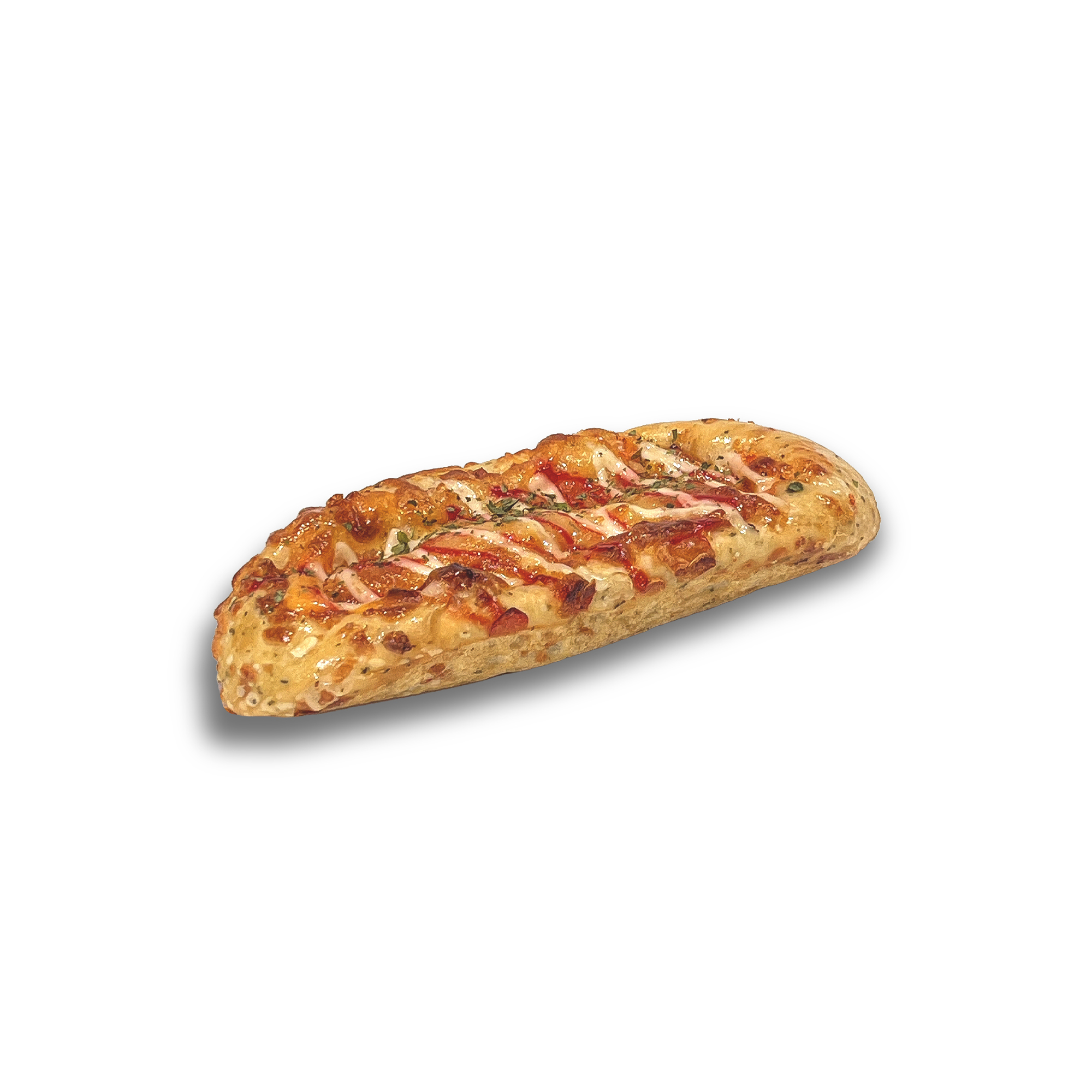 Bánh mì xúc xích dăm bông nổi bật với tạo hình cuộn tròn tinh tế, ôm trọn phần nhân xúc xích xông khói đậm đà và dăm bông cao cấp bên trong. Cốt bánh mì được ủ đủ độ để đạt độ mềm xốp, thơm bơ. Điểm nhấn của bánh chính là lớp phô mai nướng tan chảy trên bề mặt, kết hợp cùng một chút sốt béo ngậy và lá thơm, tạo nên hương vị mặn, béo hòa quyện khó cưỡng.